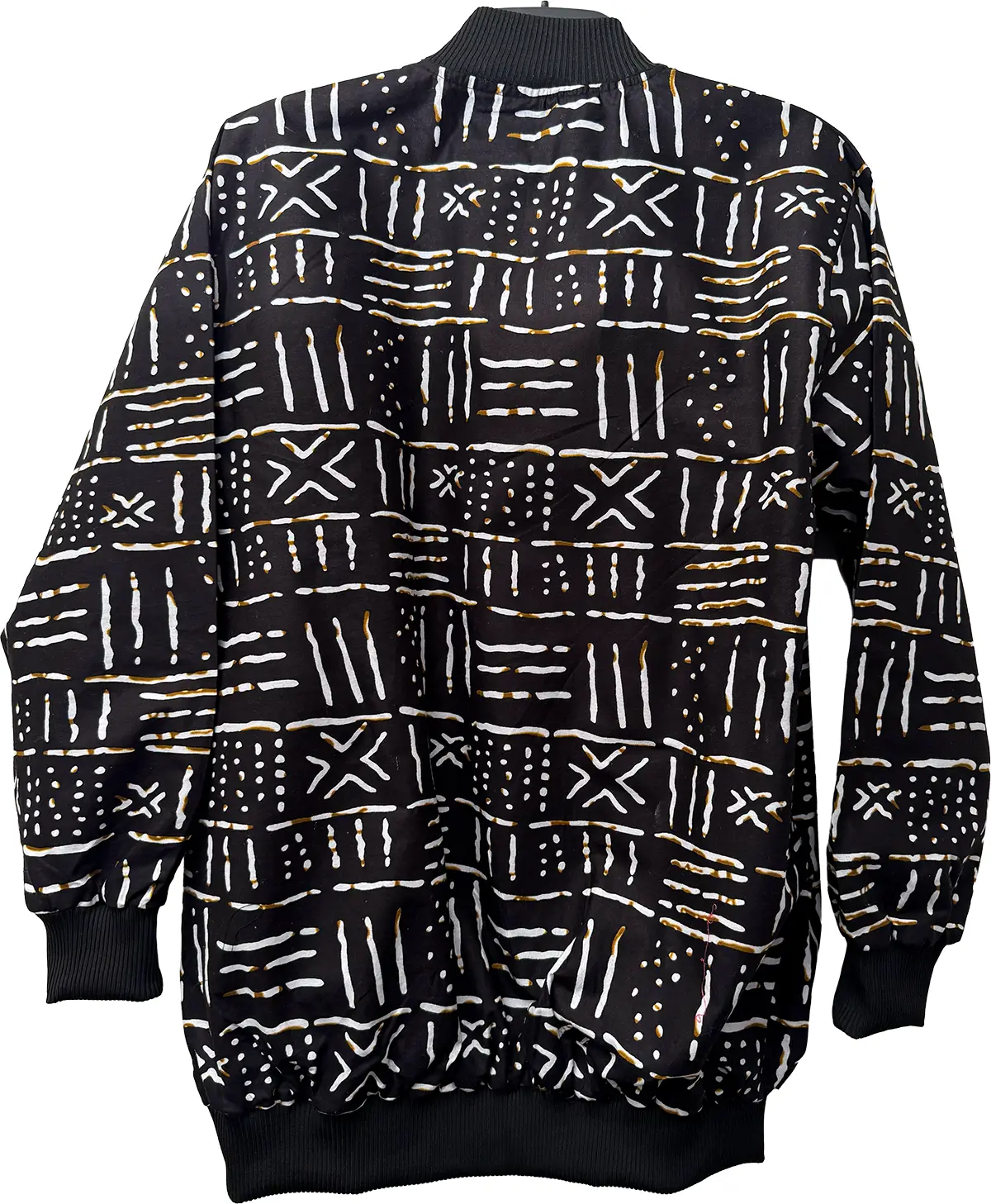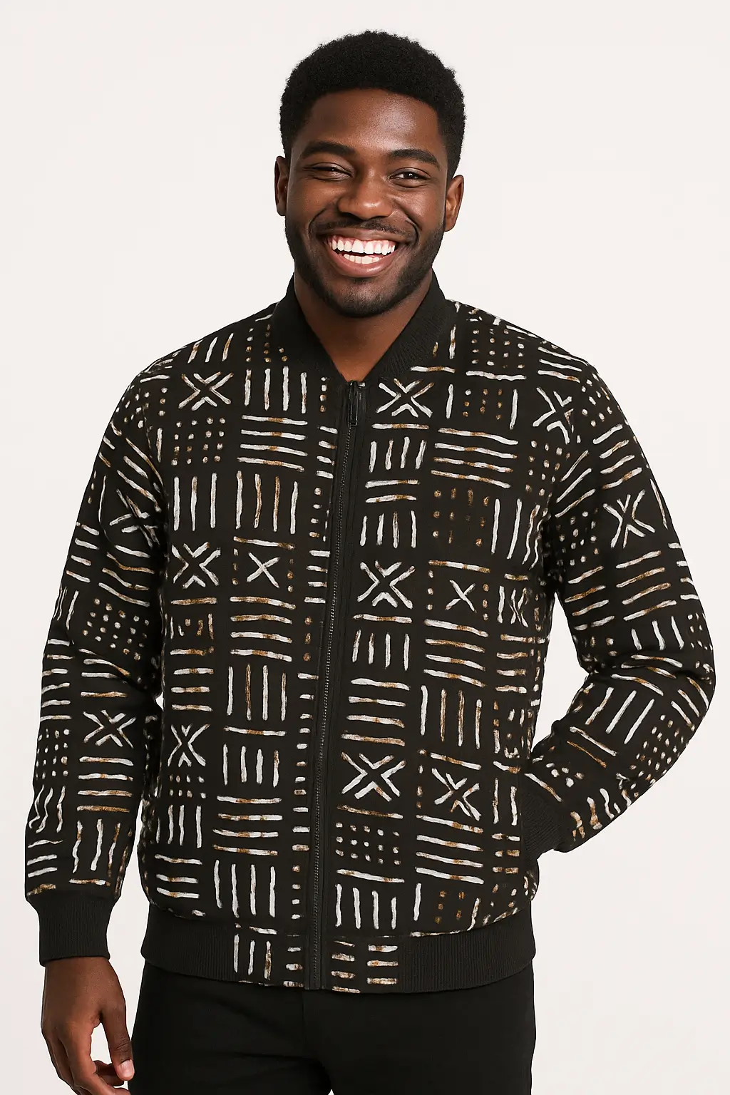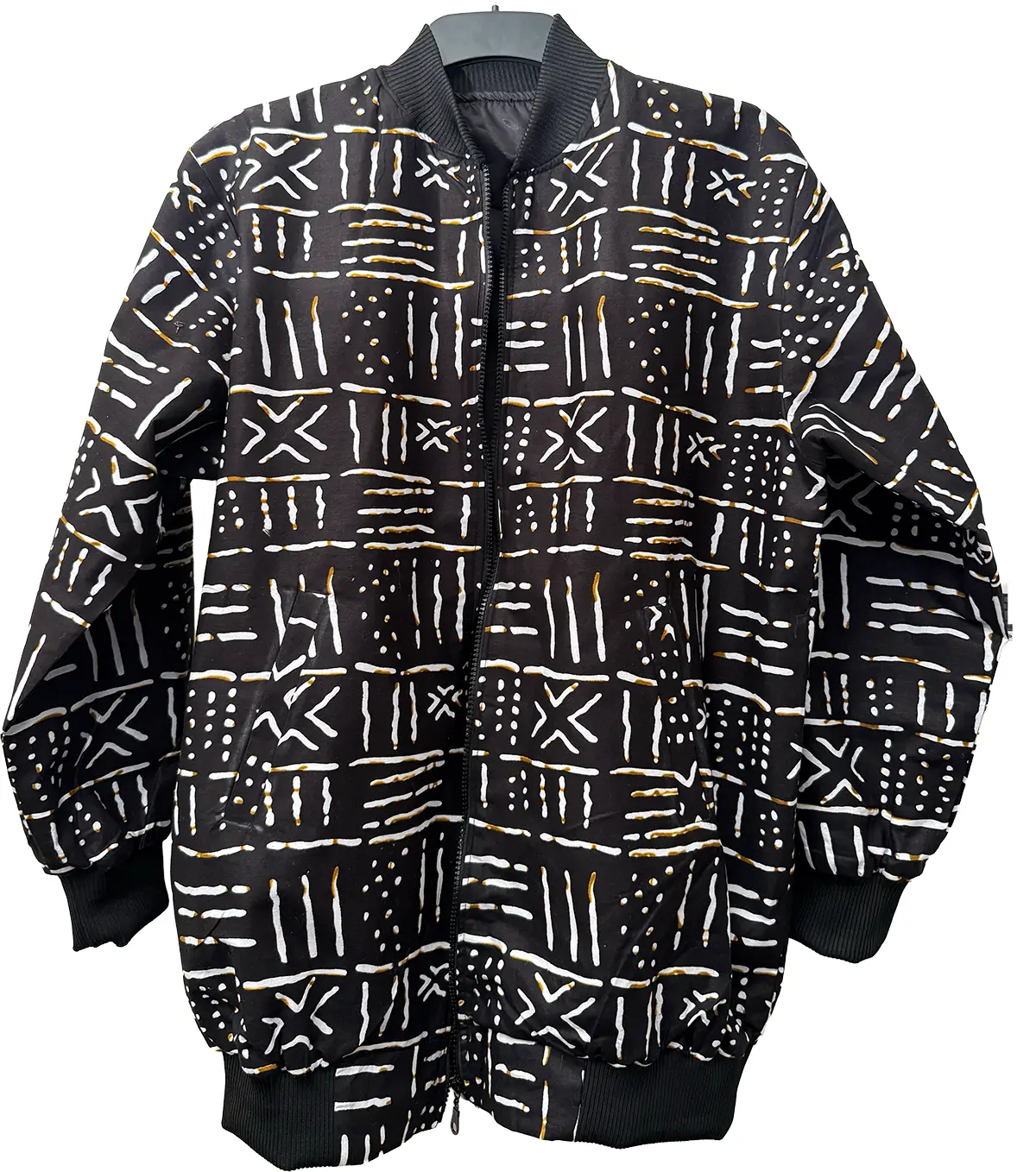 This Àṣà Tó Yẹ́ inspired bomber jacket is crafted with to dignify your root, styled for today. The black base is brought to life with touch of of lighter colours and gold patterns, giving it a rich, standout look that works for both men and women.