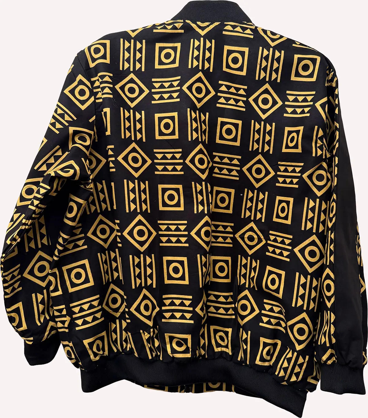 Elevate your wardrobe with this bold black and gold Ankara bomber jacket, inspired by traditional African mudcloth motifs. Crafted for comfort and style, this unisex piece blends cultural heritage with modern streetwear. The vibrant geometric patterns are printed on high-quality fabric, offering both warmth and breathability.